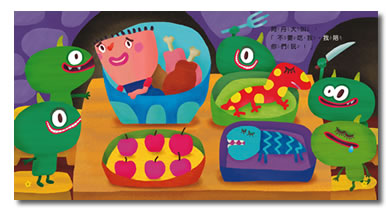 ◎簡單、誇大的造型,搭配明亮的顏色,《好喜歡溜滑梯》一書讓怪獸變得可愛起來。