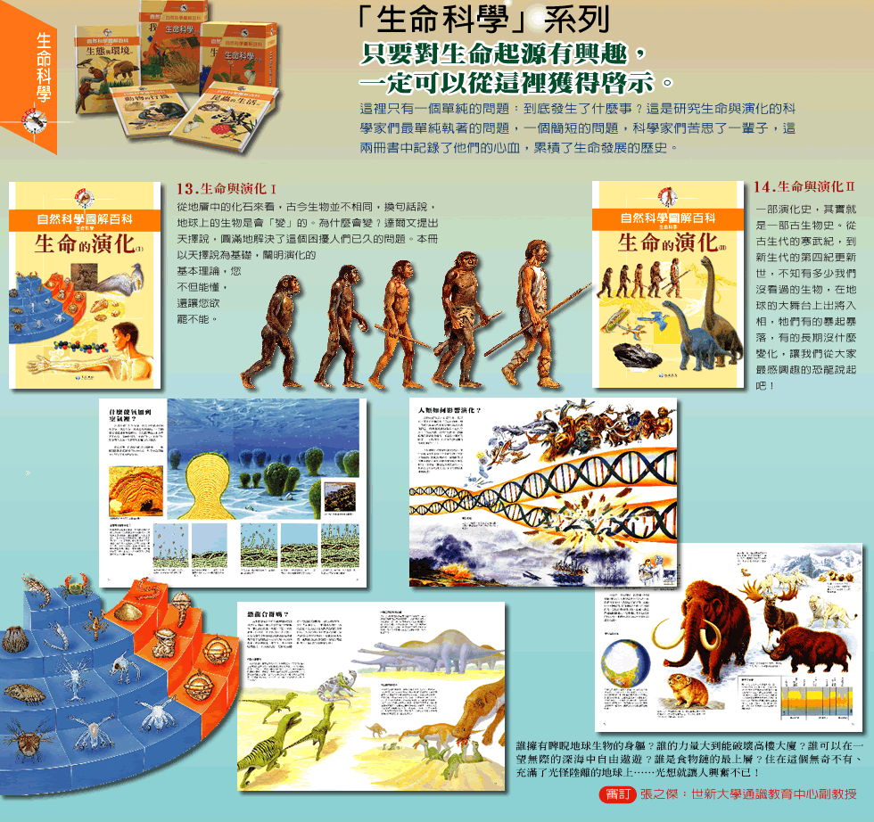 自然-地球與地貌 自然-地質與變遷 自然-氣象與氣候 自然-物質與化學 自然-能量與物理 自然-太空與星球 生命-生命的演化 生命-植物的世界 生命-水生生物 生命-昆蟲的生活 生命-生態與環境 生命-動物的行為 生命-我們的身體 工業-機器與發明 工業-交通與運輸 工業-電腦時代