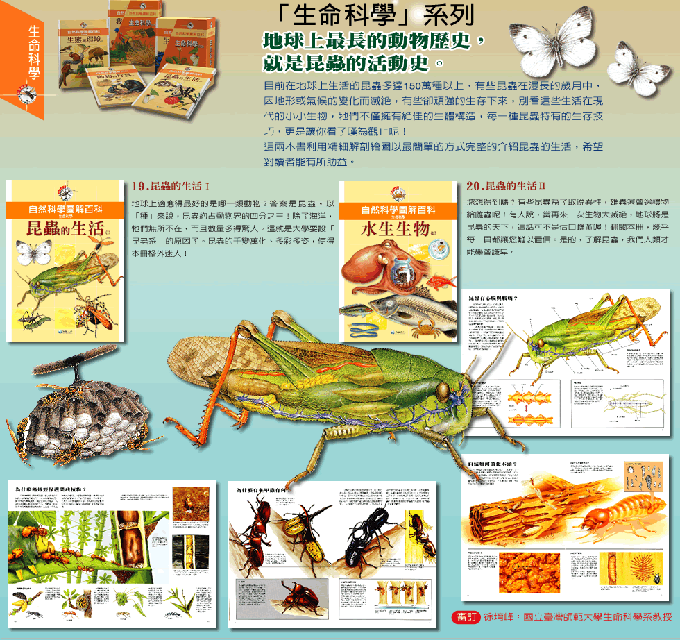 自然-地球與地貌 自然-地質與變遷 自然-氣象與氣候 自然-物質與化學 自然-能量與物理 自然-太空與星球 生命-生命的演化 生命-植物的世界 生命-水生生物 生命-昆蟲的生活 生命-生態與環境 生命-動物的行為 生命-我們的身體 工業-機器與發明 工業-交通與運輸 工業-電腦時代